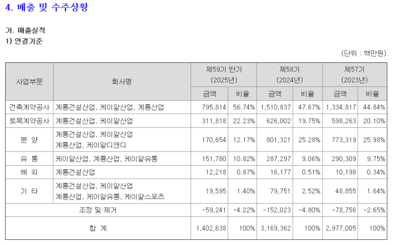 - 건설사의 주요 매출 실적은 도급계약을 통한 공사비에서 창출된다. 공사 수주 실적이 외형 성장에도 영향을 끼칠 뿐만 아니라, 시공능력평가 및 신용평가에도 큰 영향을 끼치게 된다. 또한 일정 수준의 현장 수가 유지되어야 내부 인력 운용 역시 수월하다.